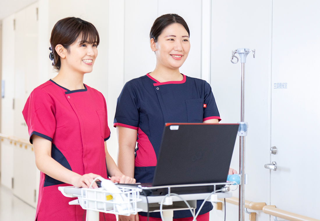 PNS(パートナーシップ・ナーシング・システム)では、先輩と一緒にケアを行うことで、わからないことはその場で確認しながら行うことができるので、新人時代は安心して仕事を進めることができました。毎日いろんな先輩とペアになることで緊張することもありますが、先輩それぞれの患者さんへの接し方を間近で見ることができ、学ぶことが多くあります。病棟には知識が豊富で、患者さんへの対応も常に優しい先輩がいます。身近な先輩からたくさん吸収して、先輩のようになることが今の目標です。