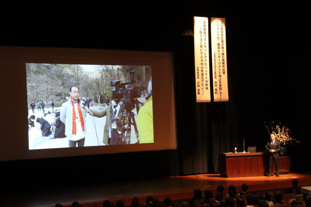 事業報告では「ブランディング」をテーマに掲げ、本部経営企画部より「JA愛知厚生連の取り組む戦略的広報」、足助病院より「足助病院ブランディングプロジェクトの矜持」について発表しました。近年、組織全体で強化してきた広報活動について、これまでの取り組みと今後の展望が示され、「全員広報」を合言葉に、職員一人ひとりが意識を高めていくことを確認し合いました。