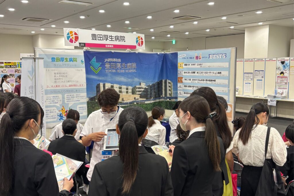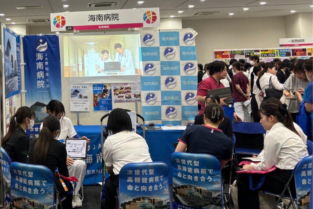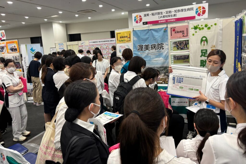 2025年7月6日、ウインクあいち(愛知県産業労働センター)で行われた「マイナビ看護学生・就職セミナー」にJA愛知厚生連の8つの病院がブースを出展しました。会場には1,000人を超える学生さんが来場し、大盛況となりました。