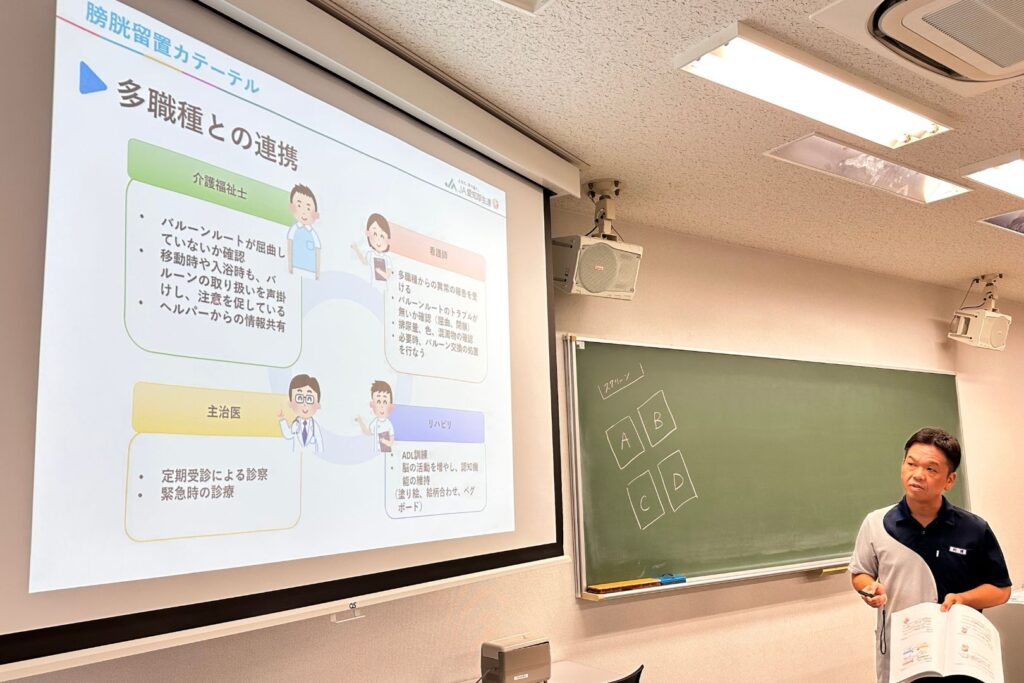 膀胱留置カテーテルについて説明する介護福祉士の杉浦琢也さん