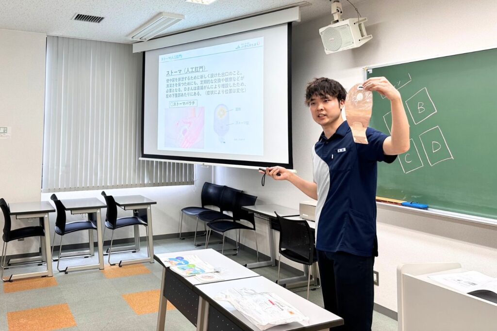 人工肛門(ストーマ)について説明する介護福祉士の太田知希さん