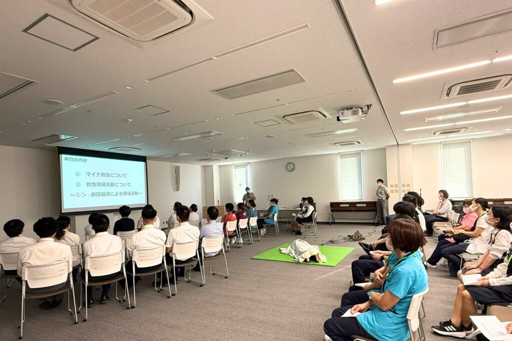 2025年7月28日、稲沢厚生病院は、救命救急研修会を稲沢市消防と合同で開催しました。稲沢市消防との研修会は、医療連携を深めるために昨年に引き続き行いました。今回は、病院職員と消防職員あわせて約80名が参加し、研修会前半では、マイナンバーカードを救急搬送時に活用するマイナ救急についての情報共有を行いました。後半では、救急隊員による急病人への対応についてデモンストレーションが行われ、病院へ搬送されるまでの対応についてわかりやすく解説いただきました。救急搬送前の救急隊の活動について知ることができ、病院職員にとって貴重な機会となりました。