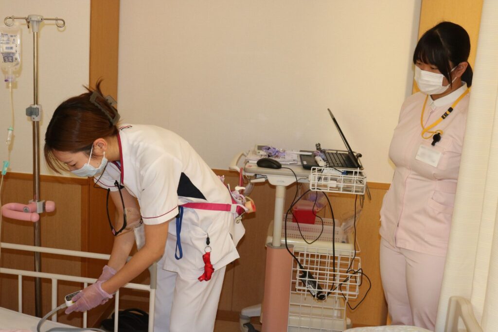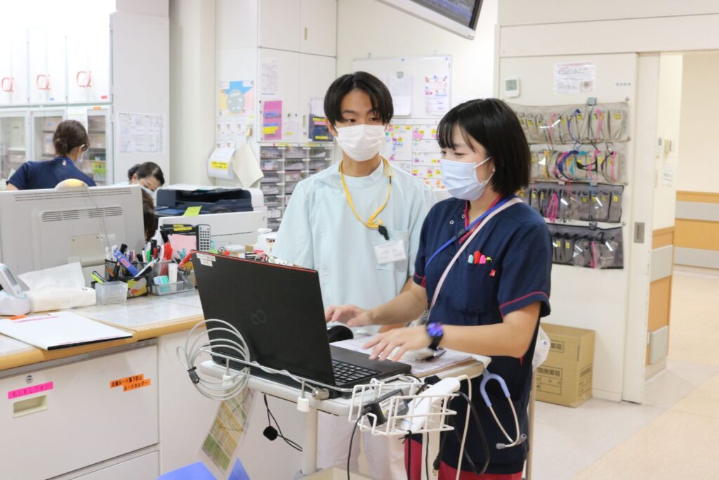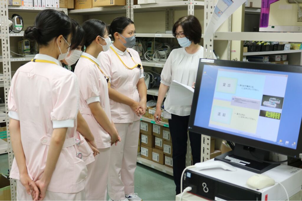 海南病院では、2025年7月30日、8月6日、8月13日の3日間、高校生1日看護体験を行い、合計71名の生徒のみなさんに参加いただきました。生徒のみなさんは白衣を着用し、看護師の業務についての説明を受けた後、少人数に分かれて、外来と病棟を見学しました。病棟では職員とペアになり、一緒に患者さんのもとへ訪れました。実際の業務を間近で見た生徒さんからは、病棟の業務の大変さや、電子カルテの役割について質問をする姿もみられました。その後、看護師の仕事に加え、海南病院が担っている海部医療圏の基幹病院としての役割を知っていただくために、病院全体の見学を行いました。