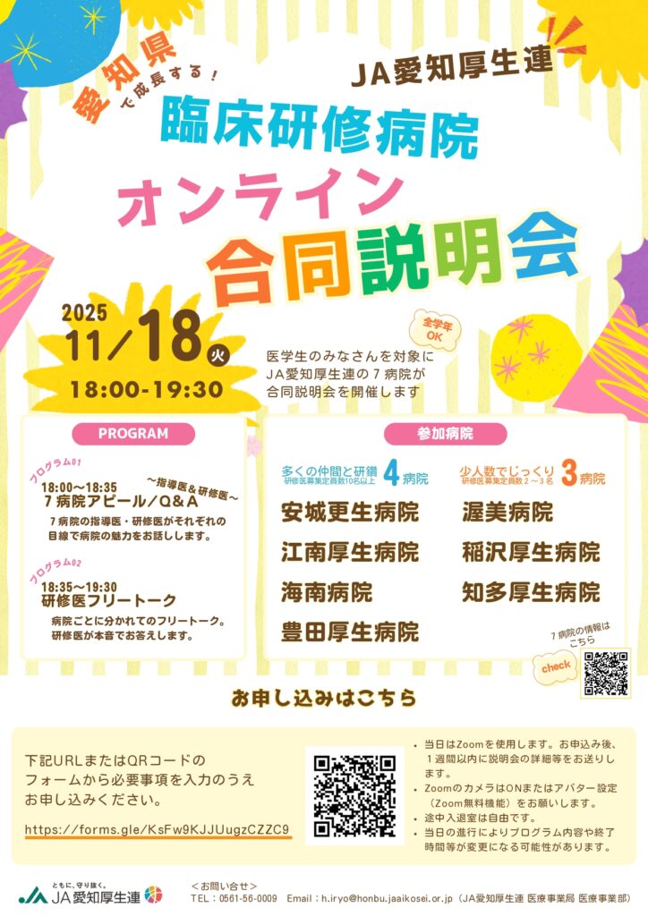 医学生のみなさんを対象にJA愛知厚生連の7病院が臨床研修病院オンライン合同説明会を開催します。