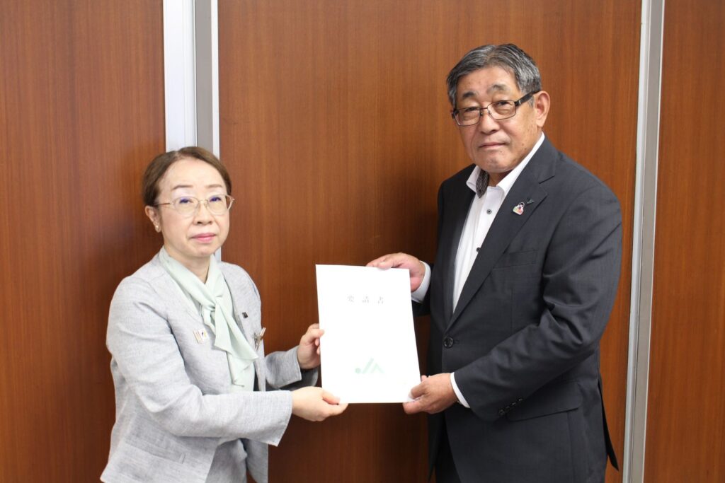 要請書を交わす愛知県の長谷川保健医療局長(左)とJA愛知厚生連の長谷川会長(右)