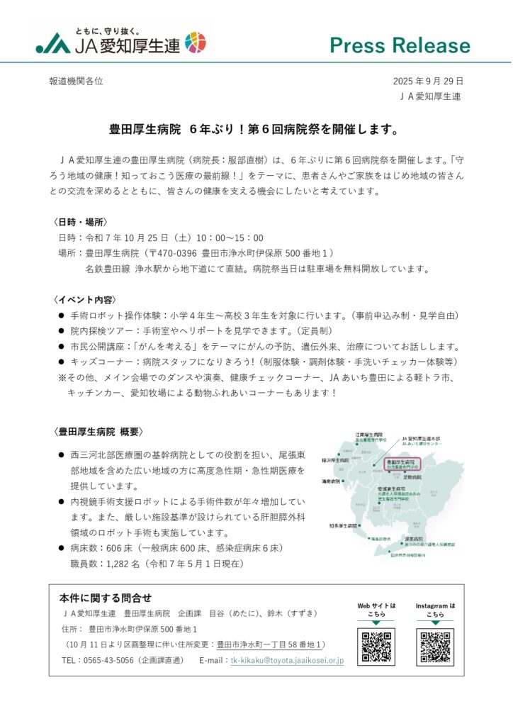 豊田厚生病院 第6回病院祭についてプレスリリースを発信しました。