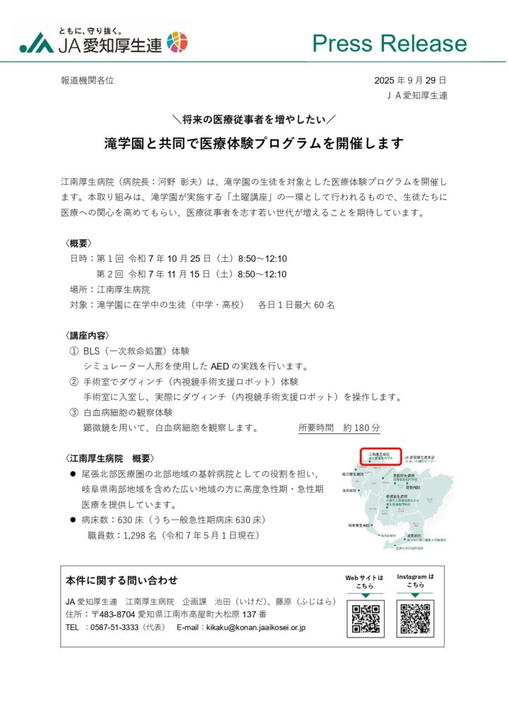江南厚生病院 滝学園と共同で医療体験プログラム開催についてプレスリリースを発信しました。