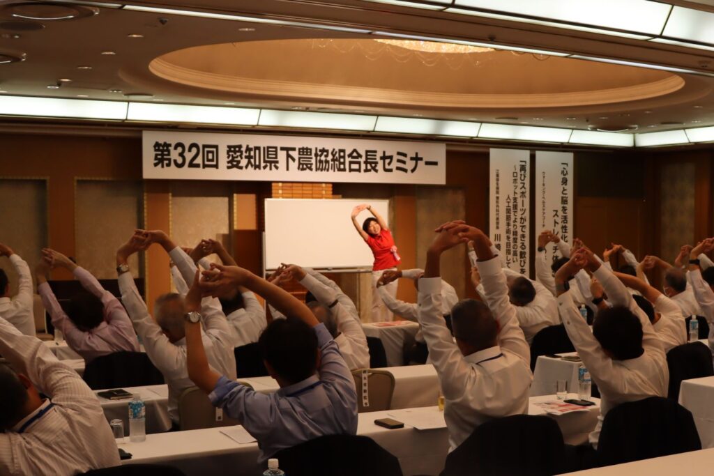 2025年10月6日、愛知県下19JAの組合長および連合会に向けて「第32回愛知県下農協組合長セミナー」を開催しました。ウォーキング・ヘルスケアコーチ みのわあい。さんが「心身と脳を活性化するストレッチ体操」をテーマに、ウォーキングや体操を通して楽しく取り組める健康維持・増進の方法について講演をしました。