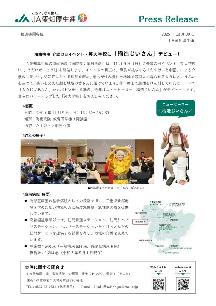JA愛知厚生連の海南病院(病院長:奥村明彦)は、11月9日(日)に介護の日イベント「笑大学校(しょうだいがっこう)」を開催します。イベントの目玉は、職員が結成する「たすけっと劇団」による介護の寸劇です。認知症に対する理解を深め、誰もが住み慣れた地域で最期まで暮らせるようにという思いを込めて、笑いを交えた劇を地域の皆さんに届けています。昨年度まで劇団をけん引していたヒロインの「もみじばあさん」からバトンを引き継ぎ、今年はニューヒーロー「稲造じいさん」がデビューします。さらにパワーアップした「笑大学校」をお楽しみください。