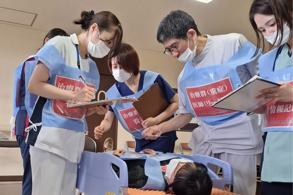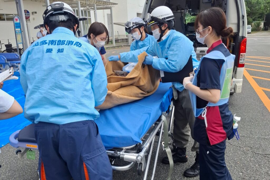 2025年10月18日、地域災害拠点病院に指定されている知多厚生病院は、大規模災害に備え消防隊や地域の医療機関、町役場と合同で訓練を行いました。今回の訓練では、震度7の地震が発生したと想定し、関係機関と連携して多数の傷病者の受け入れとトリアージおよび救護活動を実施しました。実際に消防隊によって知多厚生病院に模擬患者が搬送され、治療班が模擬患者の症状に応じた治療を行い、スムーズに患者さんを受け入れるための手順を確認しました。