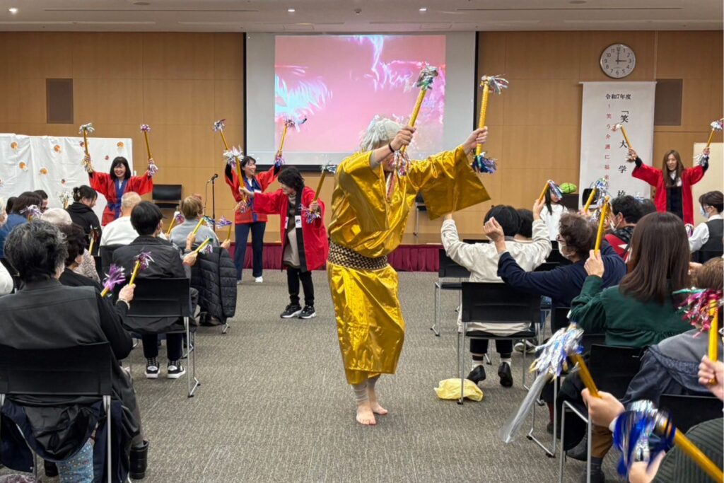 11月9日、海南病院は介護の日のイベントとして「笑大学校」を開催し、職員で結成するたすけっと劇団による寸劇を上演しました。寸劇では、認知症や老老介護、ヤングケアラーなどをテーマに、介護を受ける方と支える家族の双方に焦点をあて、介護を身近に考えていただく機会になりました。さらに、今年度からNEWヒーローとしてデビューした「稲造じいさん」が金色の衣装で登場し、参加者と一緒にサンバを踊り、会場を大いに盛り上げました。