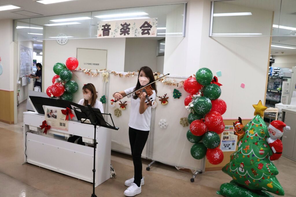 2025年12月8日、安城更生病院は新生児センターに入院中の赤ちゃんとご家族に向けてクリスマス音楽会を開催しました。赤や緑のバルーンで華やかに飾られた会場は、音楽ユニットPalette(パレット)のお二人によるピアノとヴァイオリンの優しい音色に包まれ、入院されている患者さん、ご家族にとって心温まるひとときとなりました。