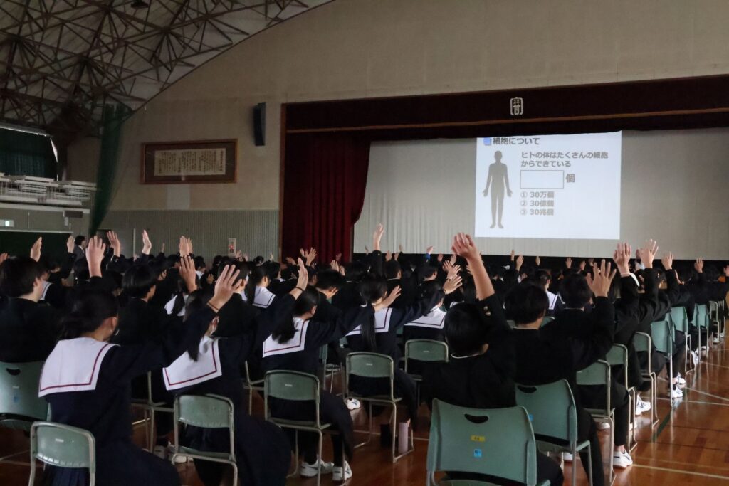「がんの授業」では、がんが発生する仕組みや予防のポイントについてクイズを交えて解説し、生徒たちは熱心に耳を傾けていました。生徒たちにがんについて正しい知識を身に着けてもらうよう、がん教育を継続してまいります。
