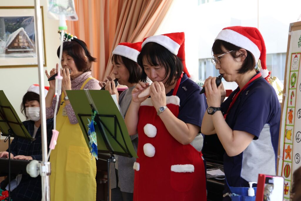 2025年12月15日、安城更生病院は緩和医療センターに入院中の患者さんに向けてクリスマス会を開催しました。サンタやトナカイの仮装をしたボランティアと職員が、ピアノやオカリナの演奏で「ジングルベル」などのクリスマスソング6曲を披露しました。患者さんも歌を口ずさんだり、音楽に合わせて鈴を鳴らしたりと、会場は温かく和やかな雰囲気に包まれました。