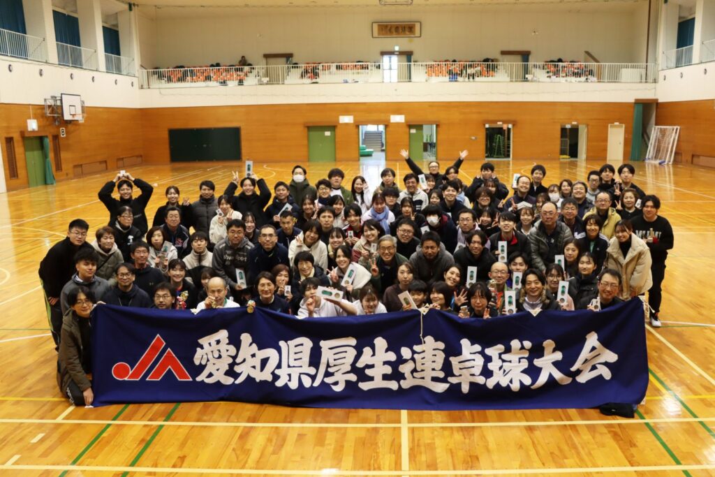 2026年1月24日、JA愛知厚生連は「第37回厚生連卓球大会」を開催しました。職員の健康増進や親睦を図ることを目的に毎年開催しています。当日は、9つの事業所から総勢102名が参加しました。大会運営には、名古屋市立大学医学部卓球部のみなさんにご協力いただき、初心者から経験者まで事業所対抗戦や混合ダブルスなどで心地よい汗を流しました。事業所対抗戦では1位海南病院、2位足助病院、3位稲沢厚生病院という結果になりました。普段は別々の事業所で働く職員同士が、試合や応援を通じて交流を深めました。