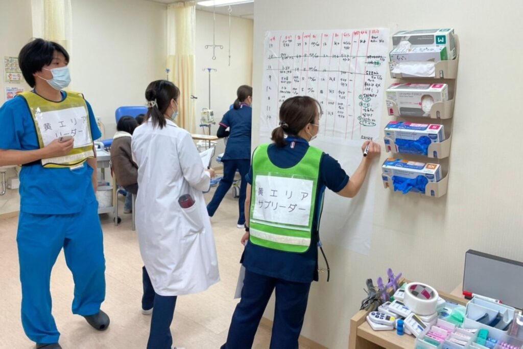 当日は、発災直後の「災害対策本部」の立ち上げから、指揮命令系統の確立、そして患者さんの緊急度を判定する「トリアージ」の実施に重点を置きました。トリアージタグや災害時用の診療記録を用いた情報の管理など、被災時に想定される流れを一つひとつ確認することで、各職員が災害時における役割と課題を再認識する機会となりました。
