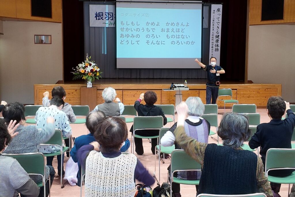 2026年2月28日、足助病院は長野県根羽村が開催する「第28回 根羽村 福祉と健康の集い」に参加しました。当日は、理学療法士による「座ってできる健康体操」の教室に加え、健康・介護相談のコーナーを設け、多くの方に足を運んでいただきました。健康コーナーでは血圧測定や体組成測定、数字合わせを用いた頭の体操を実施しました。参加された方々は、測定結果をもとに日頃の生活習慣や健康維持について熱心に相談をされていました。