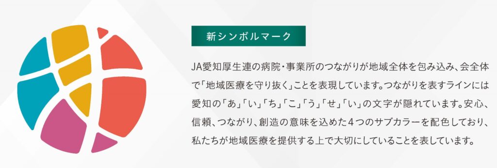 JA愛知厚生連の病院・事業所のつながりが地域全体を包み込み、会全体で「地域医療を守り抜く」ことを表現しています。つながりを表すラインに愛知の「あ」「い」「ち」「こ」「う」「せ」「い」の文字が隠れています。安心、信頼、つながり、創造の意味を込めた4つのサブカラーを配色しており、私たちが地域医療を提供する上で大切にしていることを表しています。