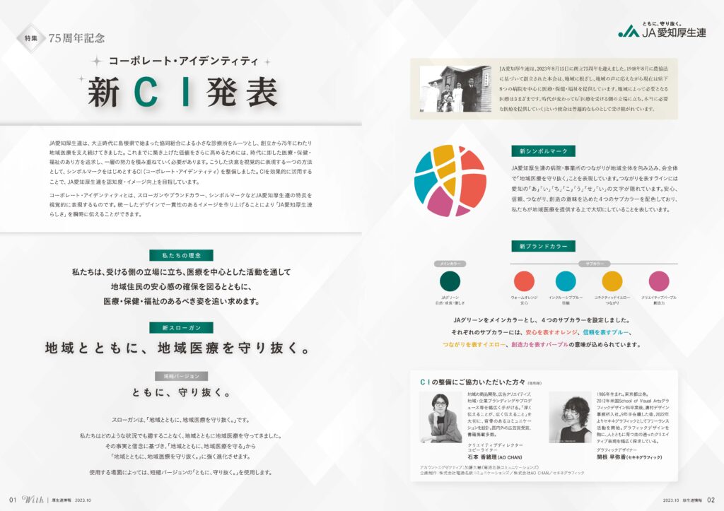 こうした決意を視覚的に表現する一つの方法として、シンボルマークをはじめとするCI(コーポレート・アイデンティティ)を整備しました。CIを効果的に活用することで、JA愛知厚生連を認知度・イメージ向上を目指しています。