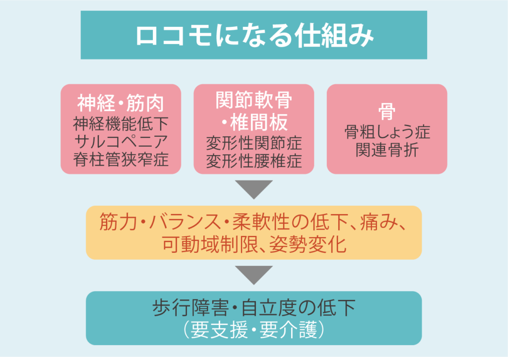 ロコモティブシンドローム(ロコモ)とは、加齢に伴う複数の運動器(骨、関節、筋肉など)の不具合が連鎖したり、合わさったりすることで、「立つ」、「歩く」という移動能力が低下した状態のことです。今回は、ロコモについてお話しします。