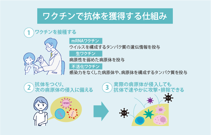 ワクチンは、感染症の原因となるウイルスや細菌またはその毒素の力を弱める目的で作られます。ワクチンを身体に接種して病気に対する抵抗力をつけることが予防接種の役割です。