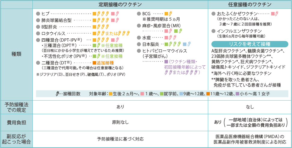ワクチンには、定期接種と任意接種のワクチンがあります。それぞれ「予防接種法」での規定や費用負担が異なりますが、どちらも重要性は同じです。予防接種のタイミングは、感染症にかかりやすい年齢などをもとに決められています。
