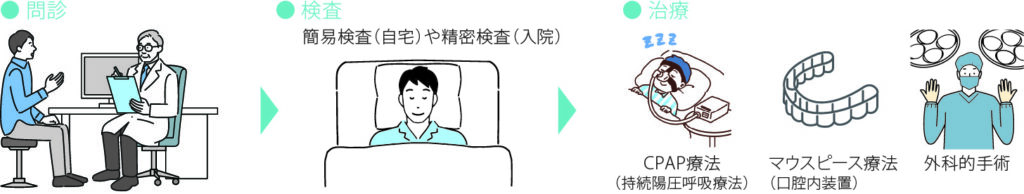 まずはいびきや眠気、既往歴などに関する問診を行います。問診で睡眠時無呼吸症候群の疑いがある方は、自宅でできる簡易検査を行い、必要であれば入院で精密検査を行います。精密検査では終夜睡眠ポリグラフィー検査(PSG)を行い、寝ている時の脳波等を測定します。睡眠時無呼吸症候群の治療方法は、CPAP療法(持続陽圧呼吸療法)、マウスピース(口腔内装置)療法、外科的手術などがあります。また、合併症のリスクを軽減させるためにも、生活習慣の改善を行うことが重要です。