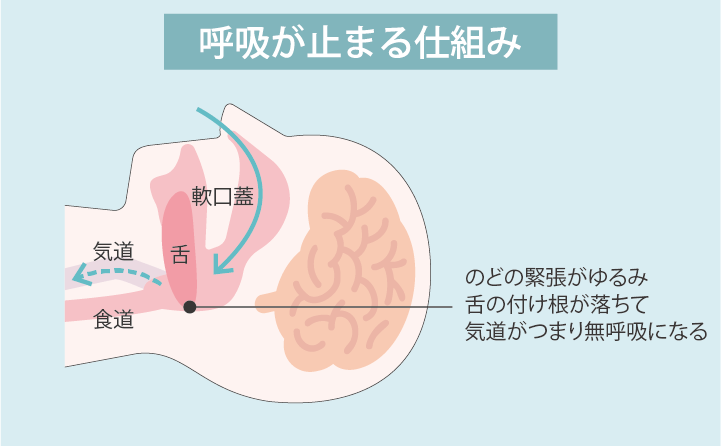 • のどの緊張がゆるみ舌の付け根が落ちて気道がつまり無呼吸になる