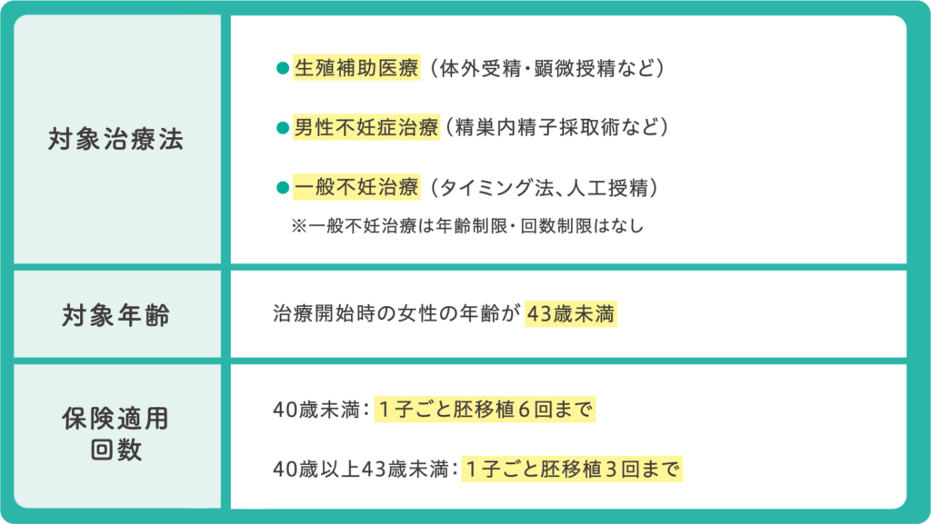2022年4月より不妊治療の一部が保険適用となりました。費用負担の大きい生殖補助医療が保険適用になったことは朗報ですが年齢・回数に制限があるので注意が必要です。診察や人工受精等の一般不妊治療には回数制限はありませんが、生殖補助医療には保険適用の条件が定められています。