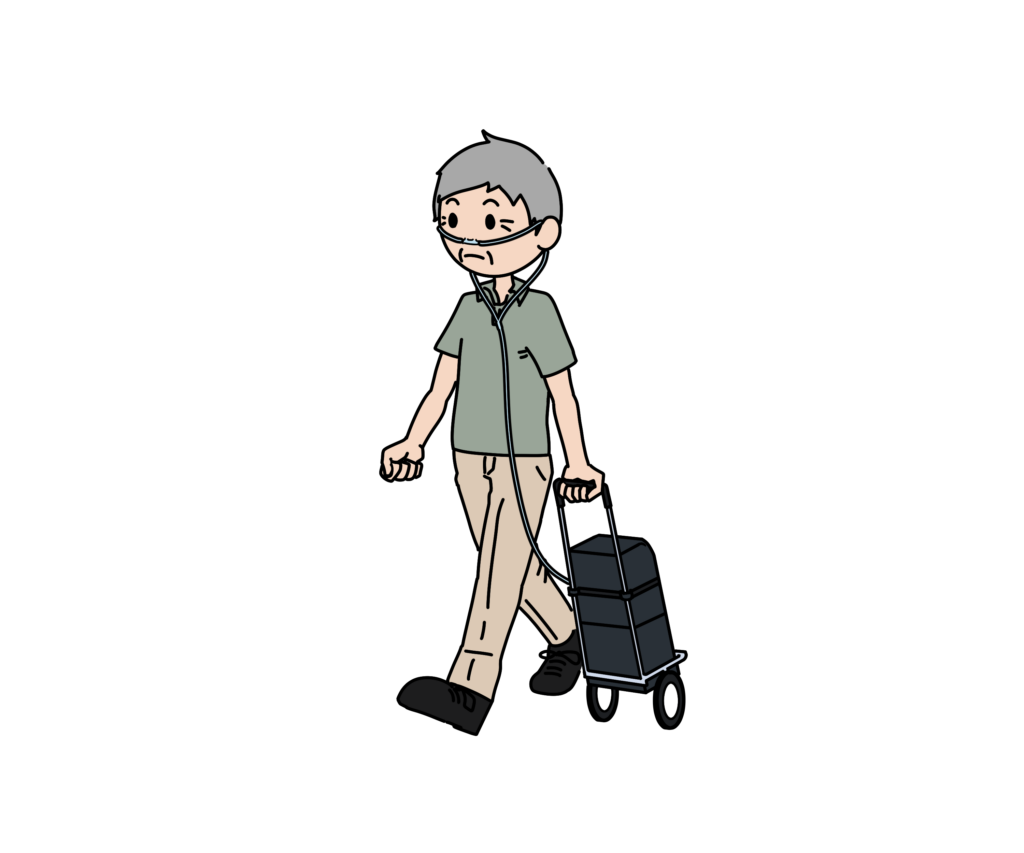 COPDが進行すると息切れのため四肢や呼吸する筋肉が弱くなり、呼吸で酸素を取り入れ、二酸化炭素を排出すること(換気)も困難となります。日常行動(特に歩行)にも制限が出てきます。そして、その結果、酸素療法や呼吸補助の機器が必要となります。