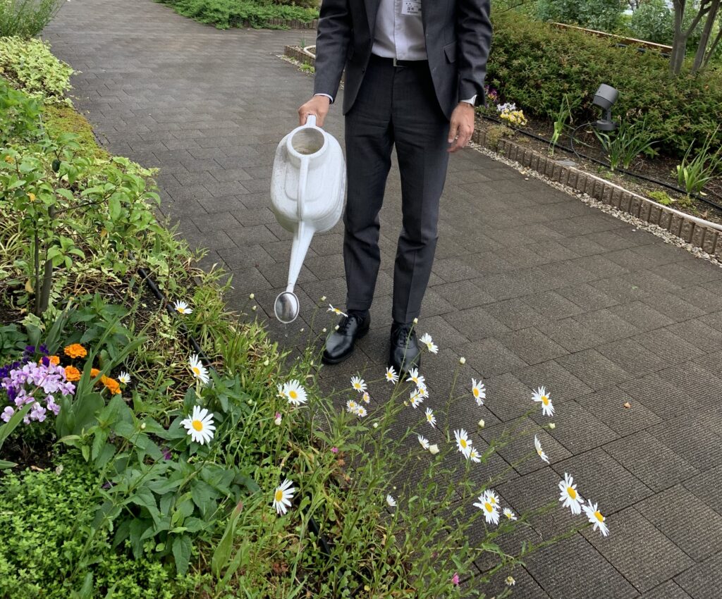 2023年4月、海南病院の玄関にある花壇の前にて(左:海南病院山本名誉院長、右:弥富造園の佐藤様)