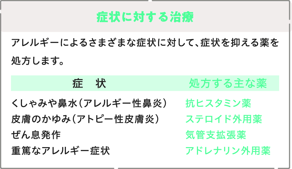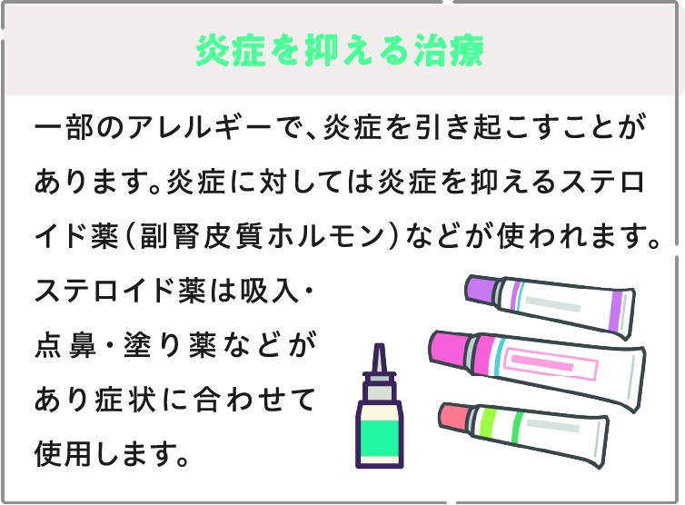 アレルギーの治療は、大きく分けて「症状に対する治療」と「炎症を抑える治療」、そして「アレルゲン免疫療法」があります。