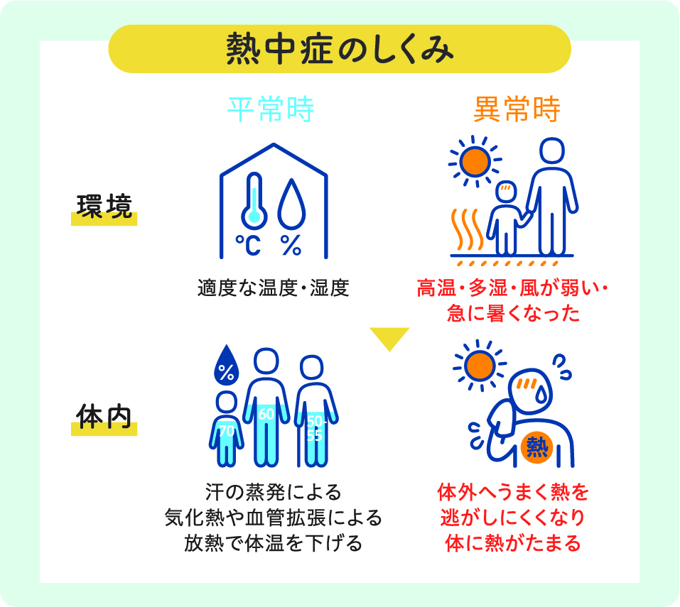 熱中症は、高温、多湿、風が弱いなどの環境下で起こります。体温を平熱に保つため、体内の水分や塩分のバランスが崩れたり血液の流れが滞ったりして体温が上昇し、重要な臓器が高温にさらされることでさまざまな症状を引き起こします。