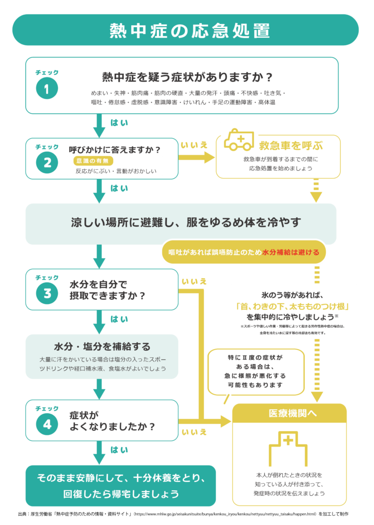 熱中症は、重度になると命にかかわる病態です。予防法を知っていれば防ぐことができ、応急処置を知っていれば救命できます。高齢者・小さいこども・体調不良の方はリスクが特に高いので、適切な知識を身につけて予防しましょう。