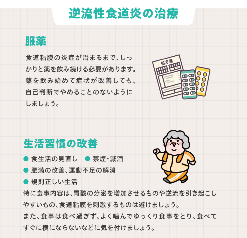 生活習慣の改善では、就寝前の食事を避けるなどの食生活や、体重の減量、禁煙、節酒などを行います。