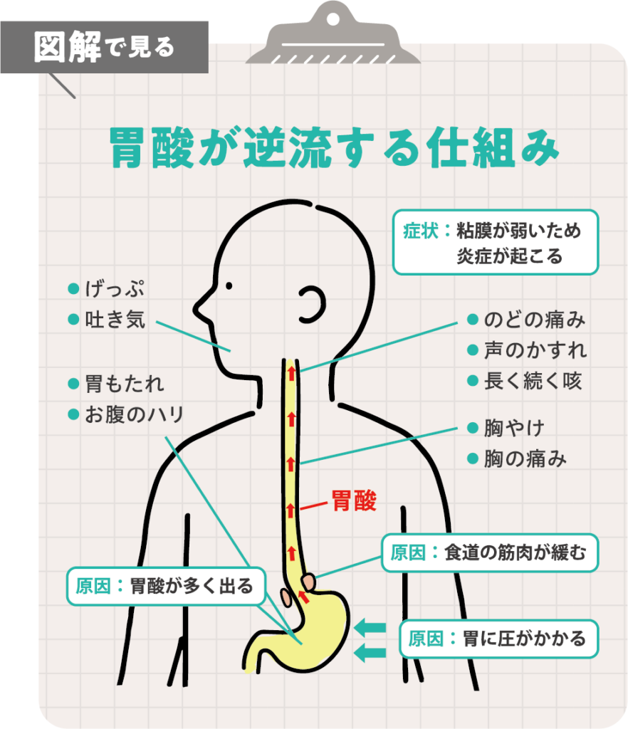 喉まで胃酸が逆流すると、喉の違和感(痛み・声のかすれ)や長く続く咳症状が出たり、胸やけ・胸の痛み等の症状が出ることもあります。