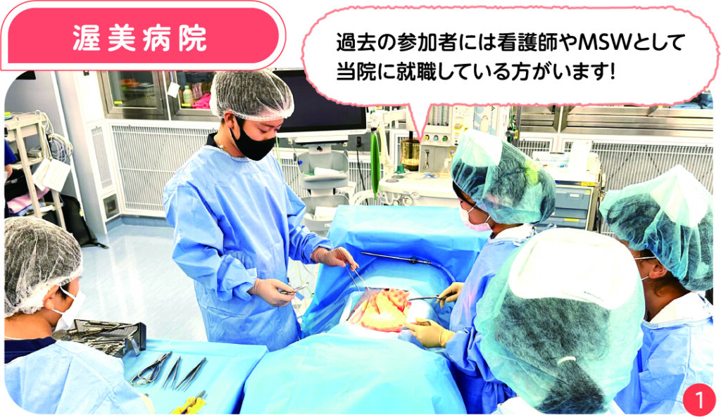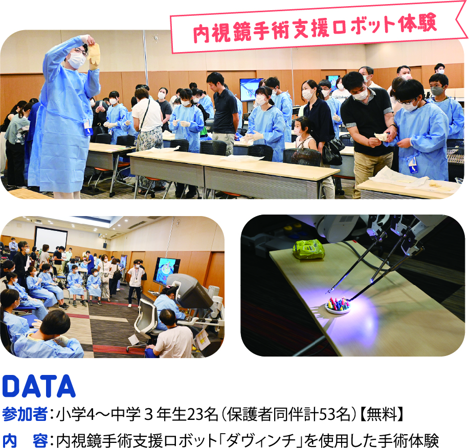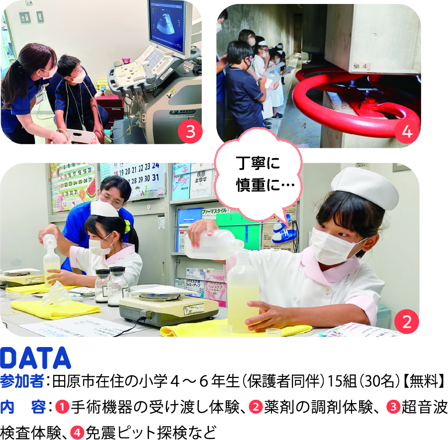 渥美病院は、2011年から毎年本イベントを開催しており、コロナ禍での3年間の中断を経て今年で11回目となりました。手術着に着替えての手術体験、お菓子を使った調剤体験や超音波検査機器での食材当てクイズなど、実際の医療行為に近い内容を体験しました。