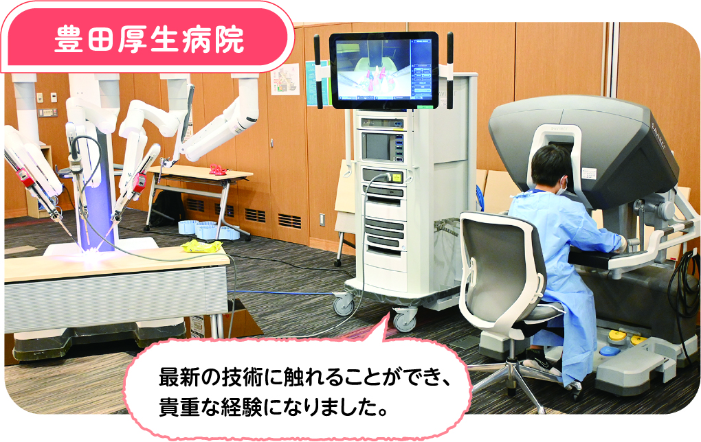 豊田厚生病院は、JA愛知厚生連初となる内視鏡手術支援ロボットの体験イベントを開催しました。各ブースはダヴィンチ(実機)、シミュレーター、ラパロ(腹腔鏡)の3つで構成し、体験内容は小さな輪を突起に引っ掛ける動作を通じて、手術の基本である「持つ(把持)」を体験しました。