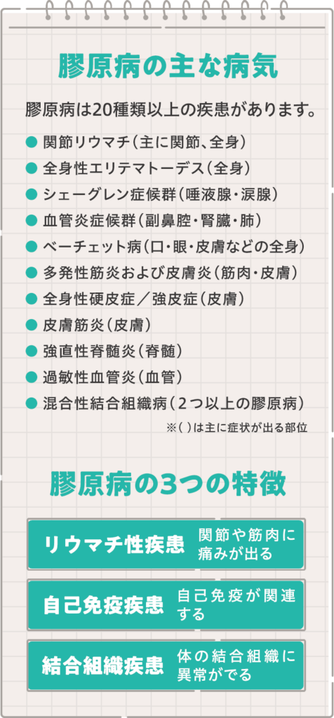膠原病と分類される病気は、20種類以上あり、共通して3つの特徴(リウマチ性疾患・自己免疫疾患・結合組織疾患)があります。一つひとつの症例数が少なく、現れる症状や部位もさまざまです。