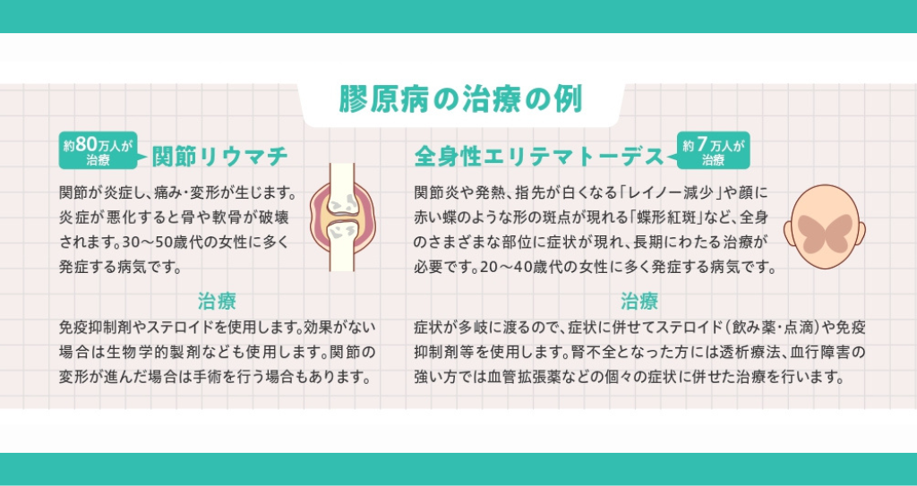 現在、膠原病とその関連疾患の多くが厚生労働省によって「指定難病」に指定されており、公費補助対象疾患となっています。