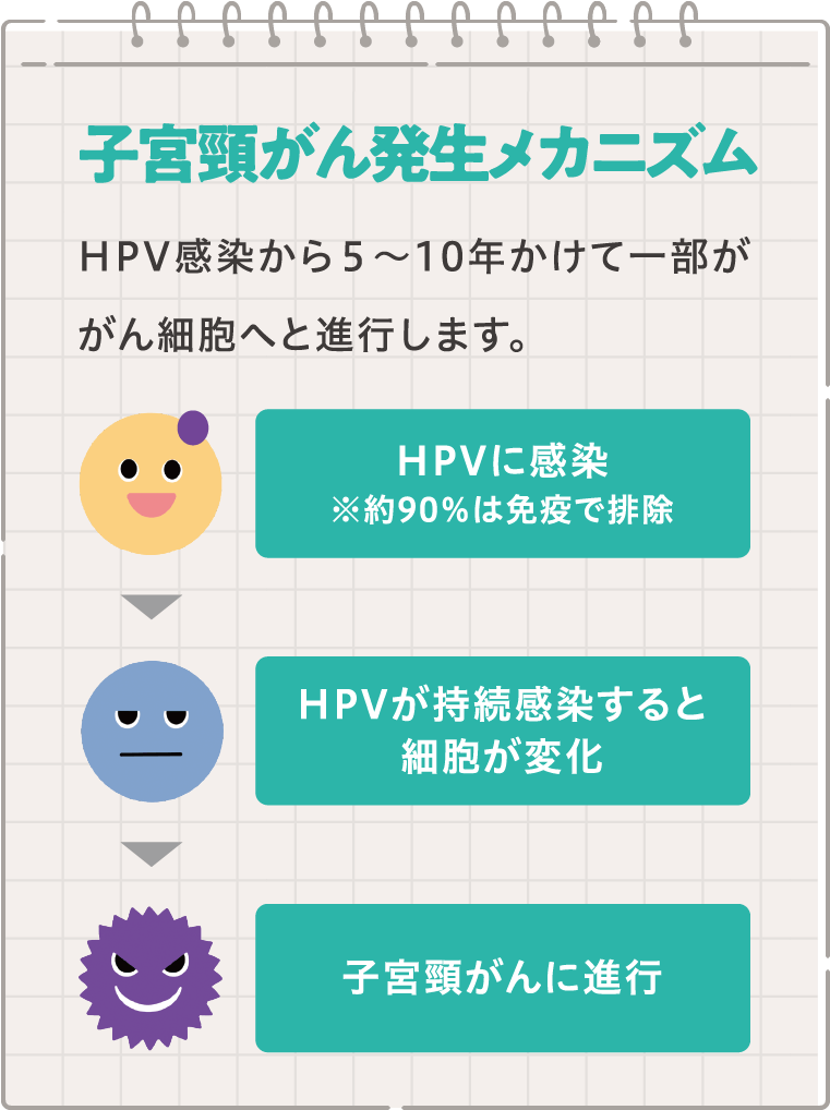 HPV感染から5~10年かけて一部ががん細胞へと進行します。