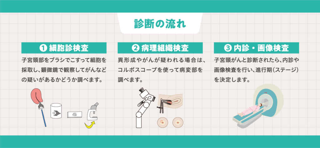 スクリーニング検査として子宮頸部の細胞診検査を行います。細胞診検査の結果、異形成やがんの疑いがある場合には、コルポスコピーと呼ばれる検査を行います。コルポスコピーでは、コルポスコープと呼ばれる拡大鏡を使って子宮頸部を拡大して観察し、病変部を観察します。そして病変と疑われる部分の組織を採取して病理組織検査を行います。子宮頸がんと診断されたら、内診や画像検査(CT、MRI、PETなど)を行い、子宮の周囲にある組織へのがんの広がりやリンパ節・他臓器への転移の有無を調べます。これらの結果に基づきがんの進行期(ステージ)を決定します。