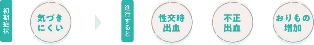 子宮頸がんは初期症状がほとんど出ないため自分では気づきにくく、発見されないまま何年もかけて進行してしまう場合があります。子宮頸がんが進行すると、「性交渉の時の出血」や「生理日以外の出血(不正出血)」、「おりものの増加」などの症状がみられます。このような症状がある場合は、早めに医療機関を受診しましょう。