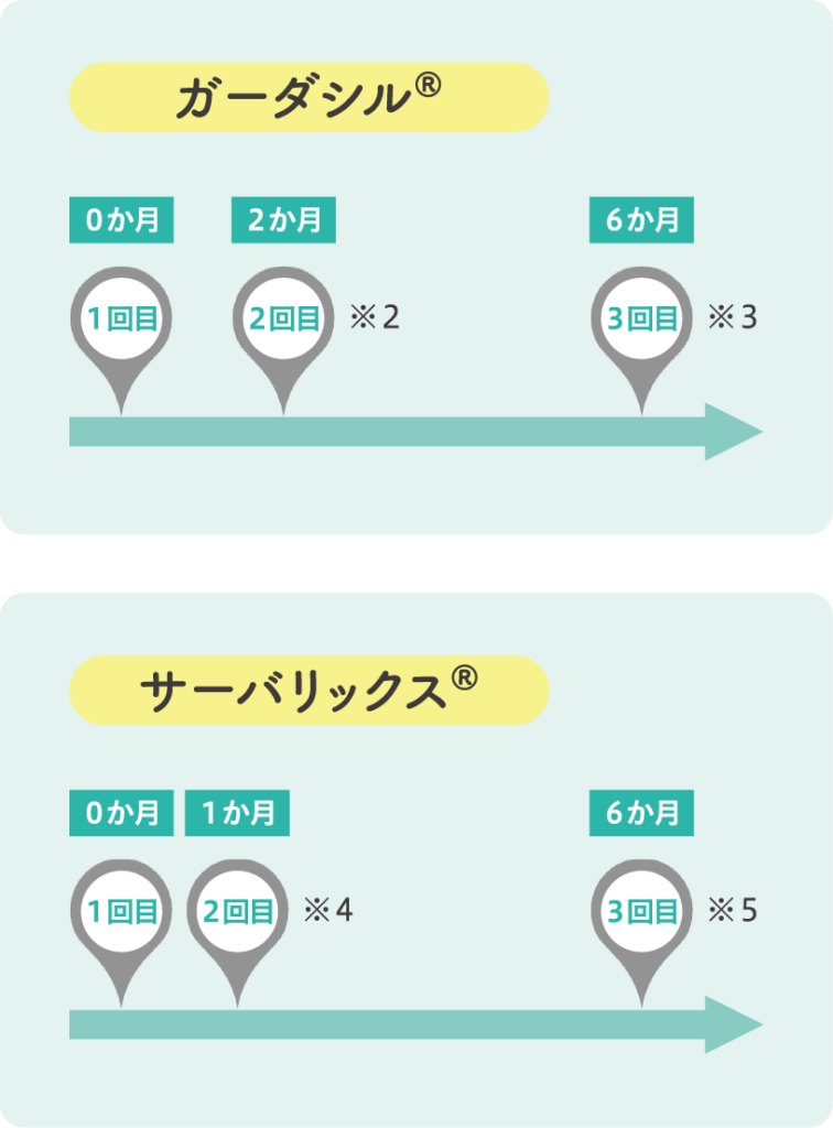 ※4・5…2回目と3回目の接種がそれぞれ1回目の1か月後と6か月後にできない場合、2回目は1回目から1か月以上(※4)、3回目は1回目から5か月以上、2回目から2か月半以上(※5)あけます。