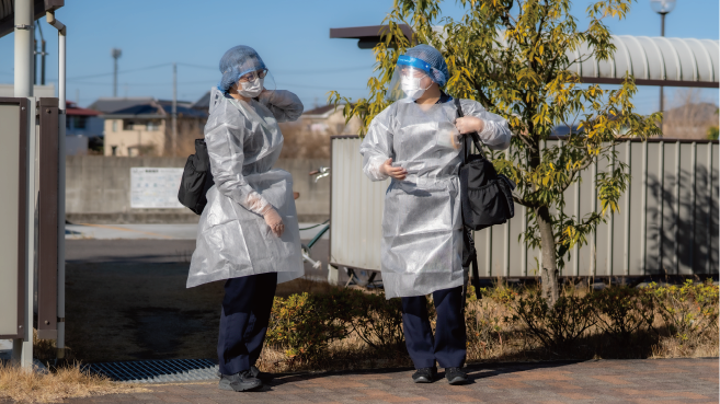 松本:2020年2月28日に病院が緊急事態の体制に入りました。その時から病院と同じように、発熱のある利用者にはコロナ感染を疑い、感染対策をとって対応していました。終末期の利用者に起こりやすい尿路感染や肺炎などの発熱でも、一度コロナは疑うということで、発熱者に対してはフル装備で対応させていただきました。利用者のところに行くと、まず、熱があるのかどうか確認させていただきました。熱があるようだったら連絡をくださいねとお願いはしましたが、高齢者も多いので、そこまで求めることはできませんでした。それから、もし職員が感染した場合には訪問をお休みしてもらうか、別の訪問看護ステーションで対応してもらうこともお伝えしました。