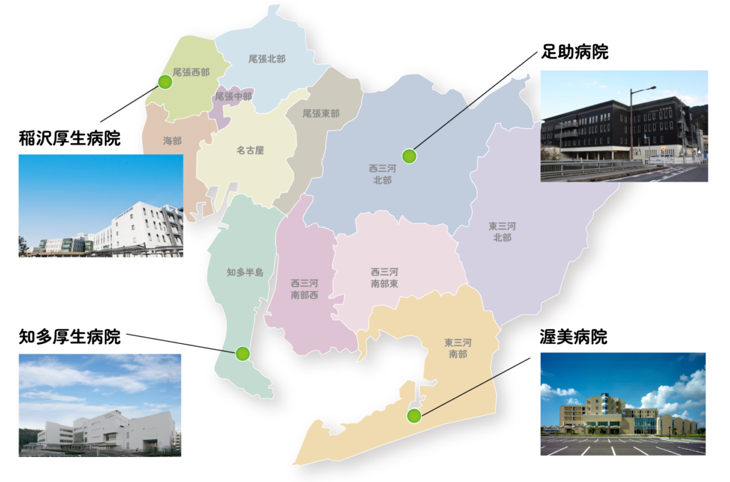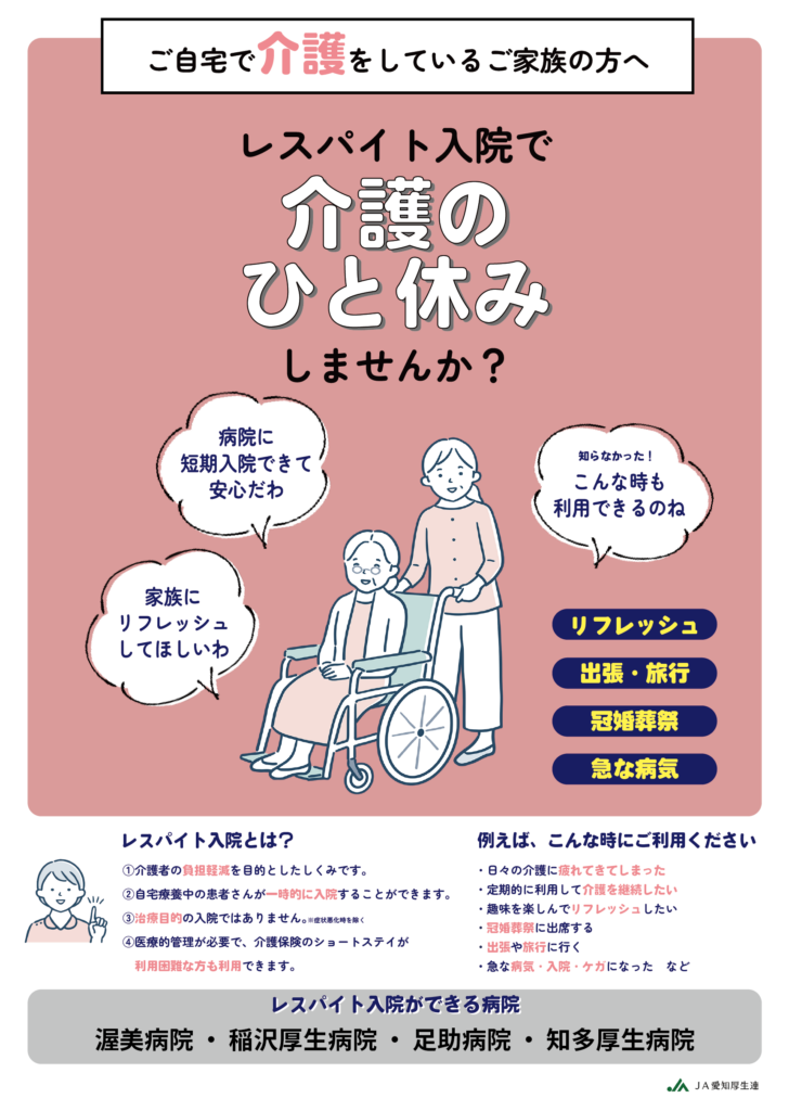 レスパイト入院ができるJA愛知厚生連の病院は、渥美病院、稲沢厚生病院、足助病院、知多厚生病院です。