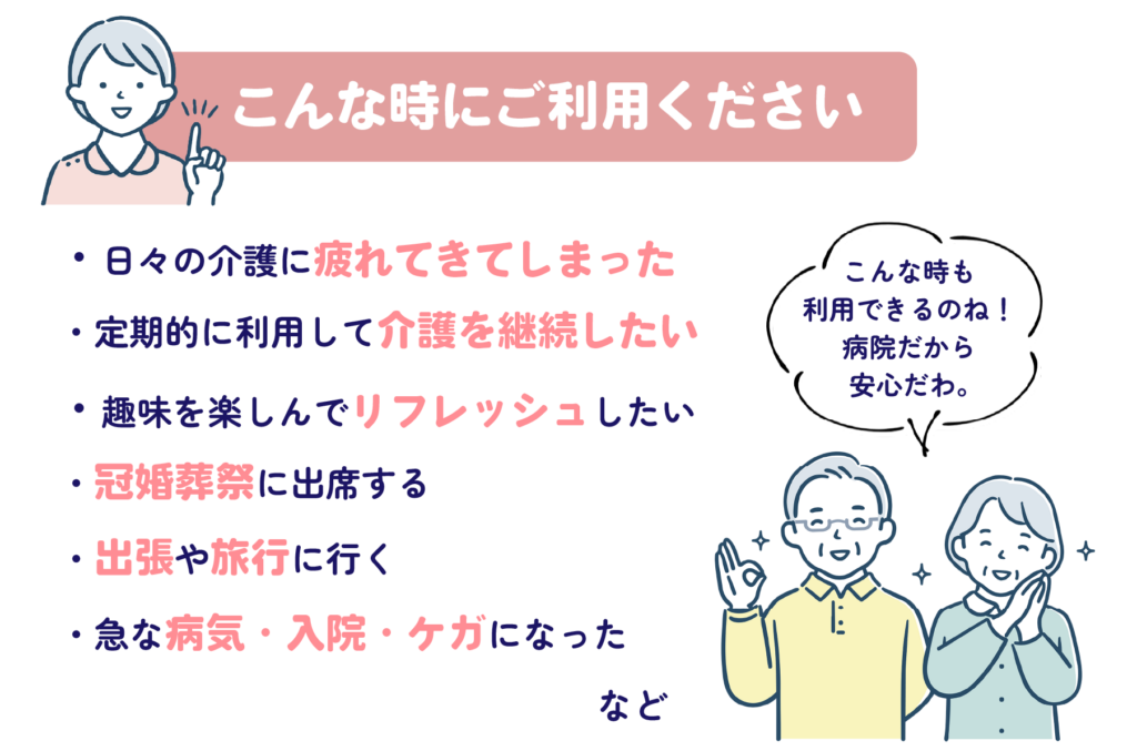 「日々の介護に疲れてしまった」「短期間介護ができない事情がある」という方は、ぜひこの機会にご利用ください。