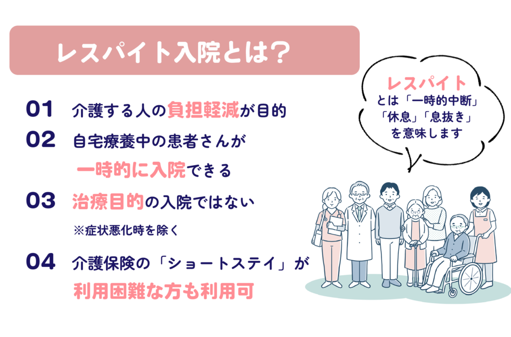 レスパイト入院は、自宅療養中の患者さんに一時的に入院していただくことで介護をしているご家族に休息していただく短期入院のことです。