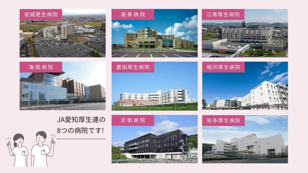 JA愛知厚生連の看護師専用サイトでは、8病院の紹介、ワークスタイル・教育制度などについて紹介しています。ぜひご覧ください!