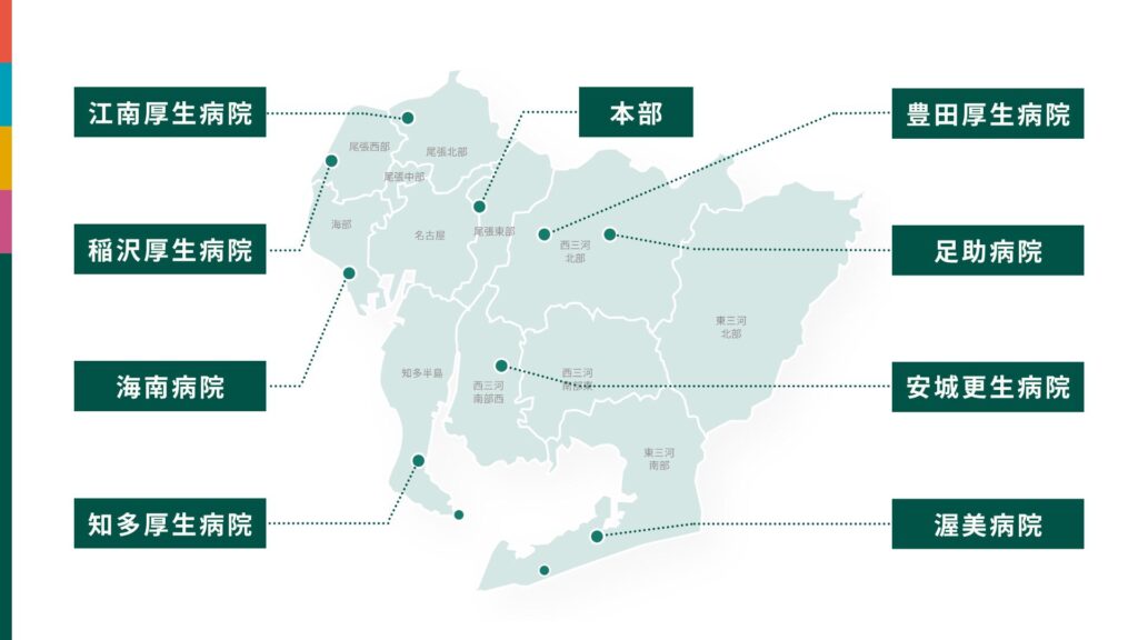 JA愛知厚生連は、愛知県内に8つ病院を運営し、「地域とともに、地域医療を守り抜く。」というスローガンのもと医療・保健・福祉を提供しています。8つの病院は公的医療機関に指定され、一般の医療機関では提供することが難しい救急・災害医療、高度・先進医療、へき地医療などの医療を担っています。